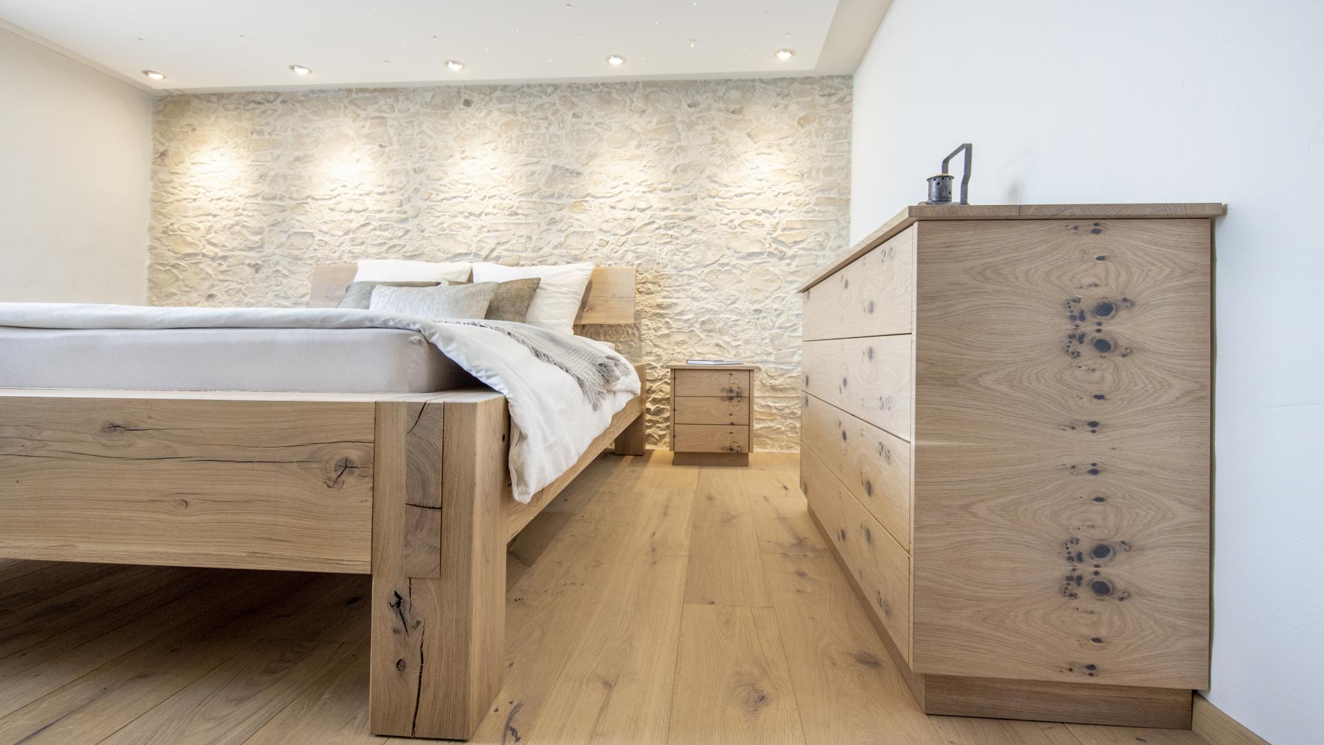 Kehrli Balkenbetten in metallfreier Konstruktion. Die überzeugende Symbiose von urigsten, stark gezeichneten, temperament- und charaktervollen, charismatischen Hölzern und schlichtem puristischen Design.